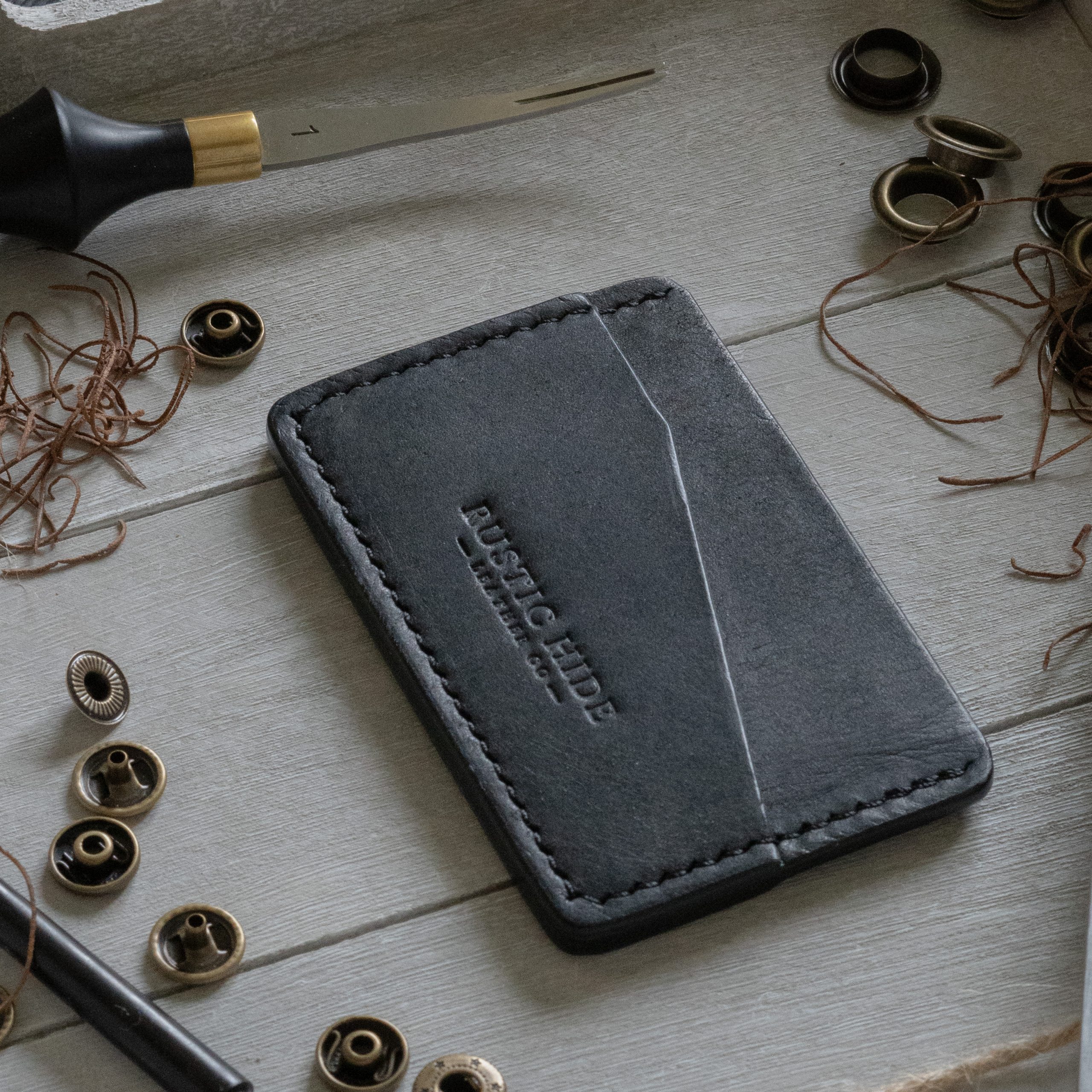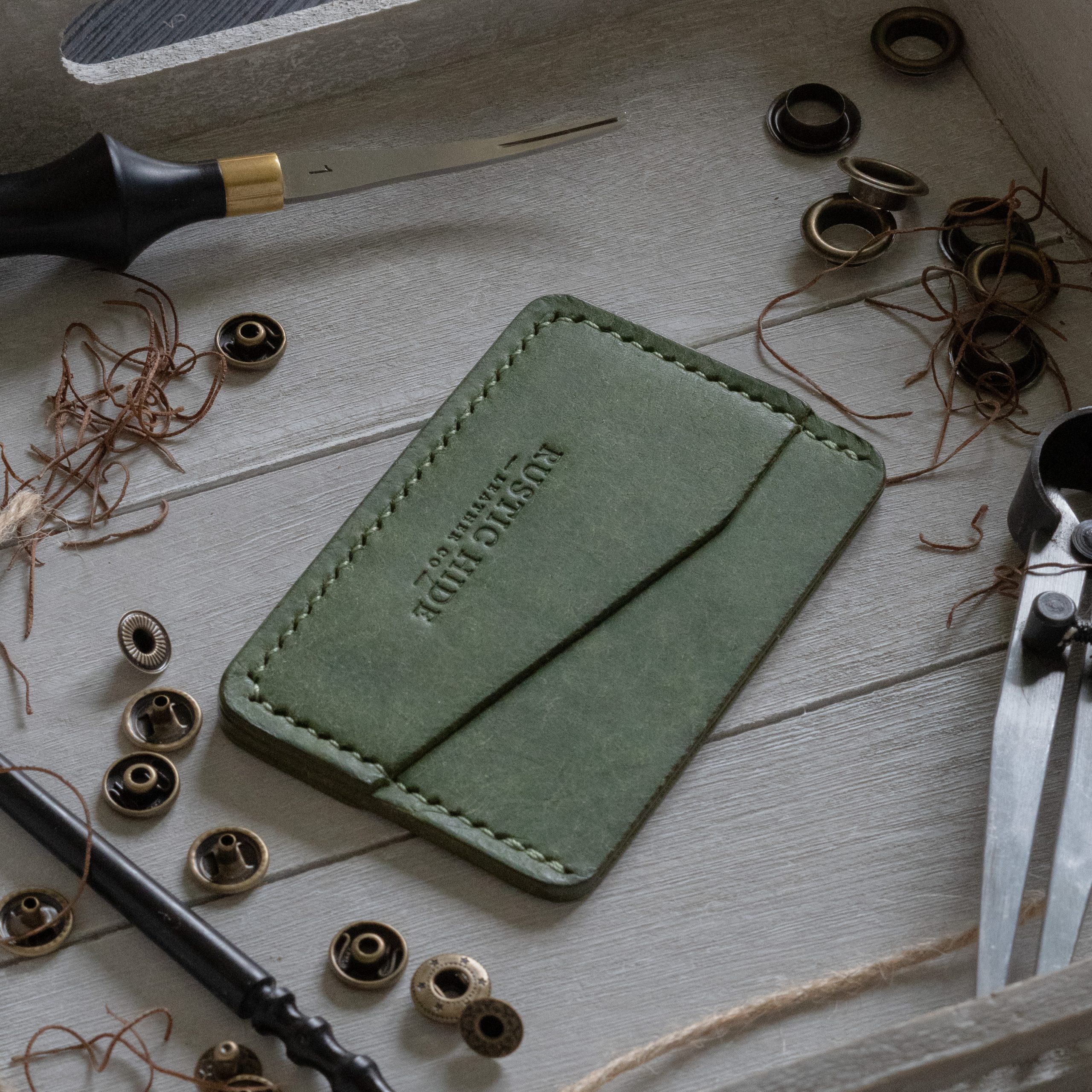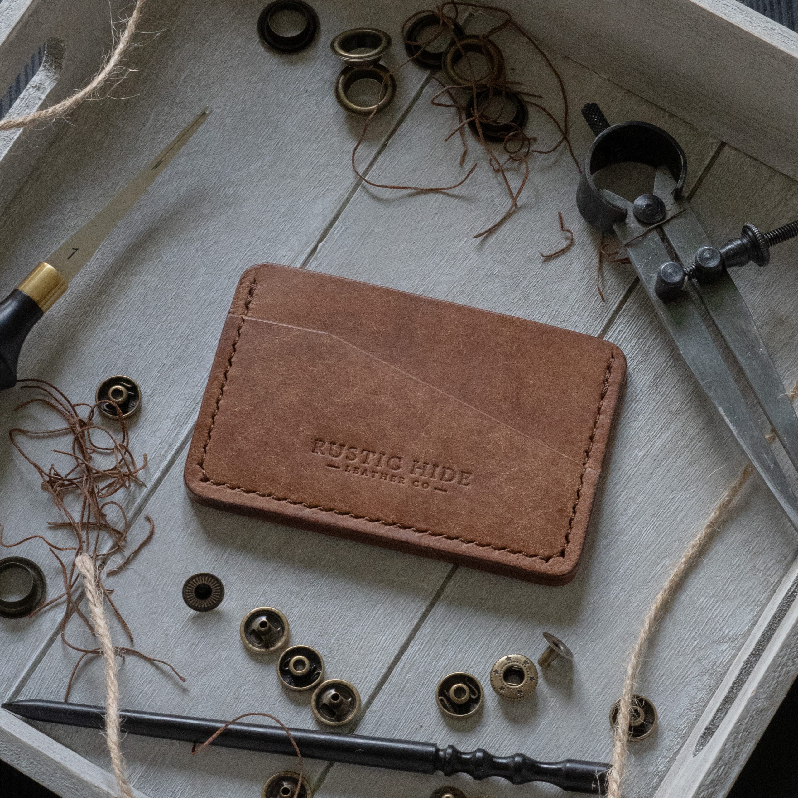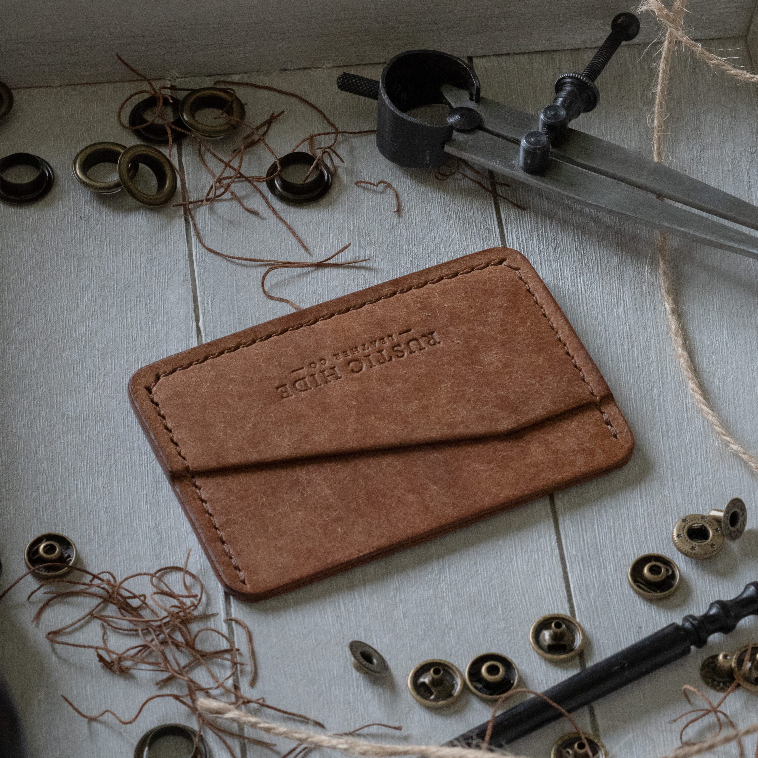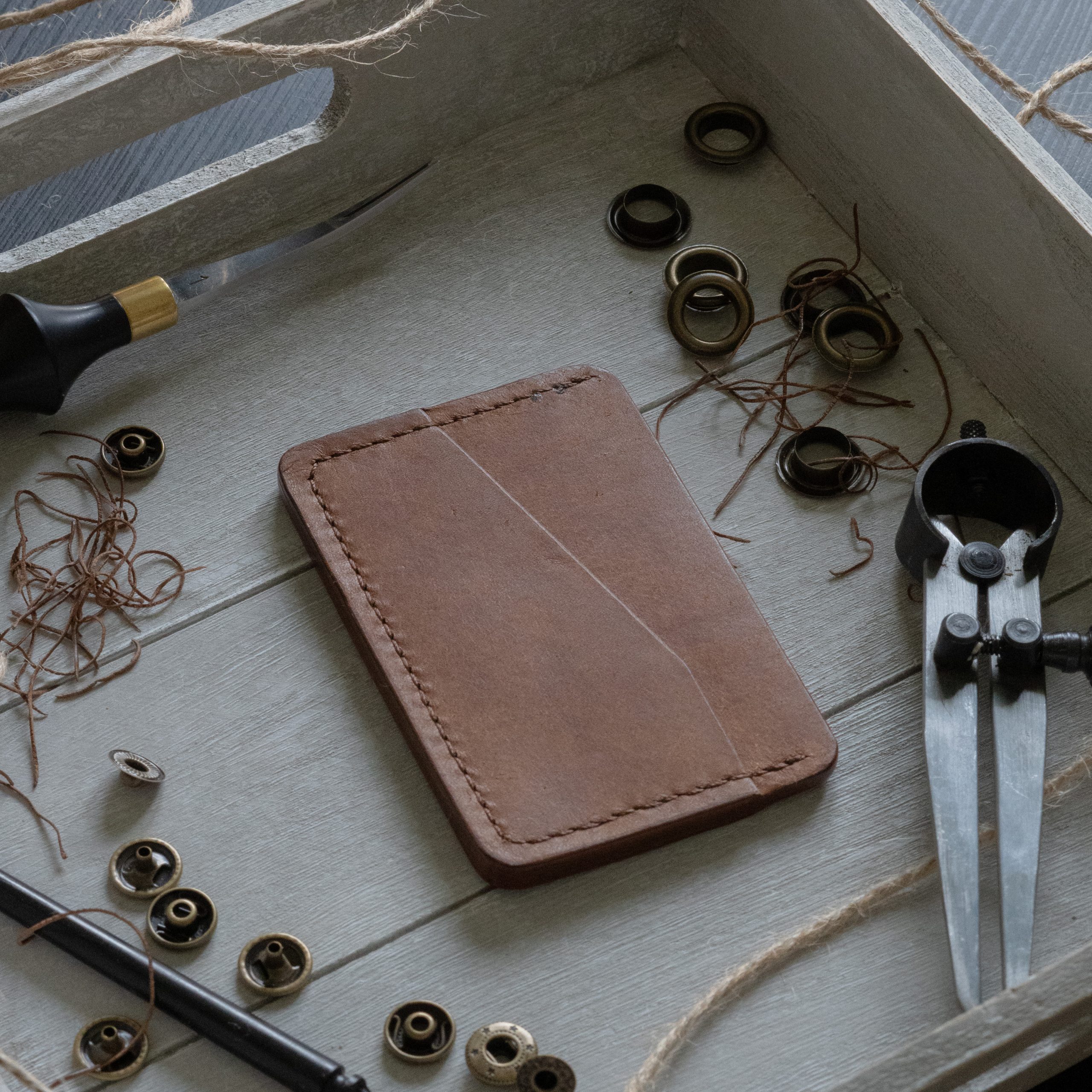 A minimalist card wallet made using full grain vegetable tanned pueblo leather. Handcrafted using premium tools and intricately detailed methods, this product is built to stand the test of time.