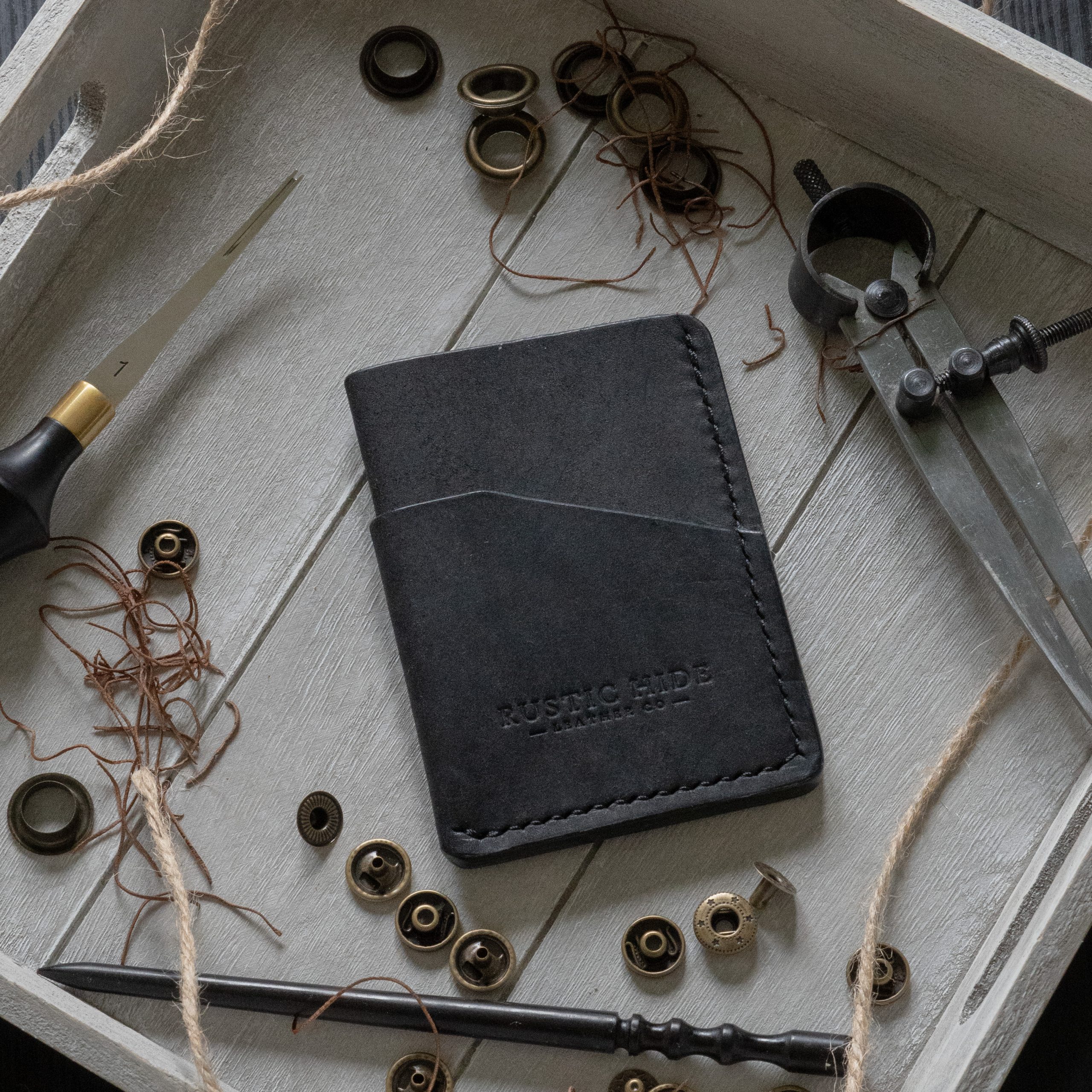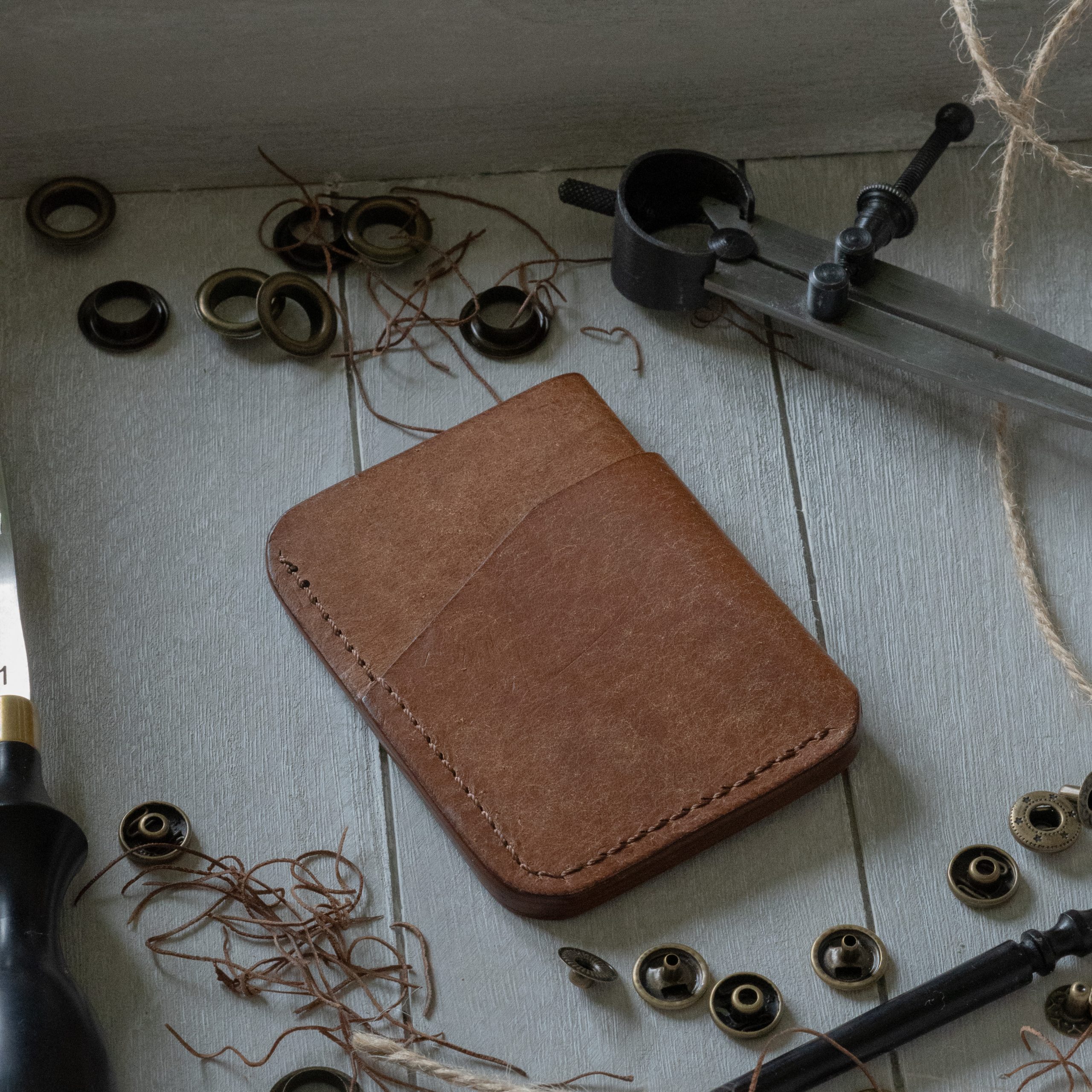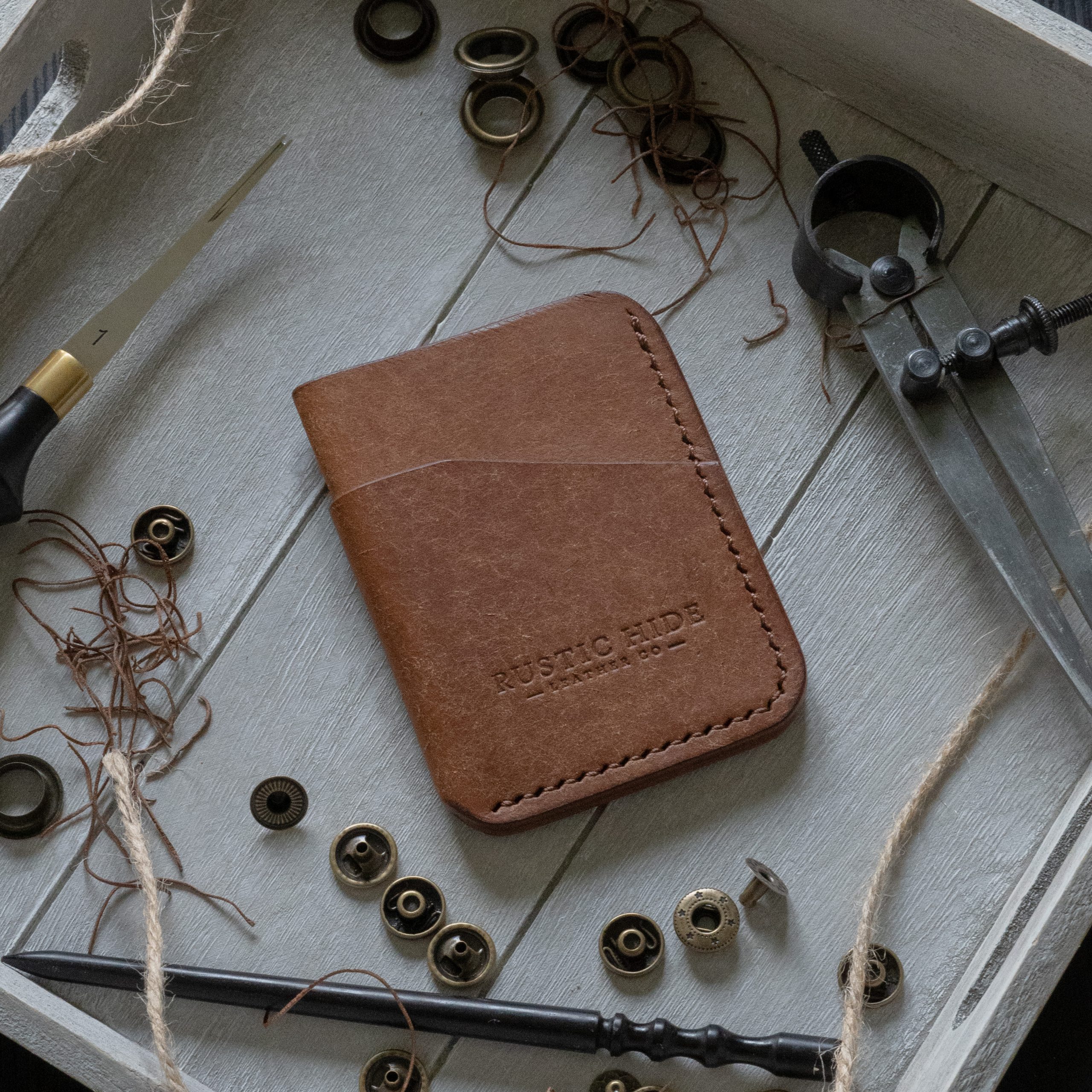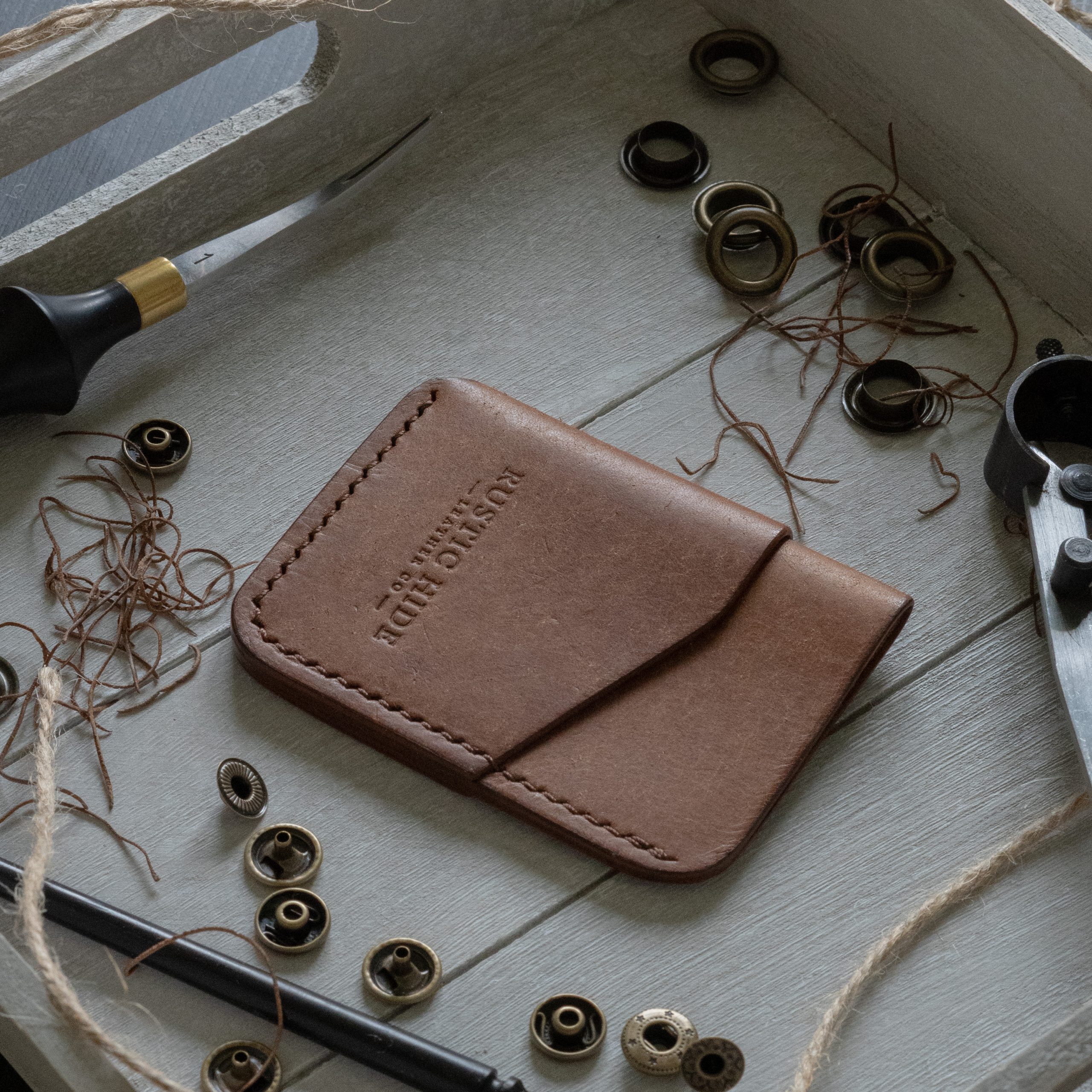 A minimalist card wallet made using full grain vegetable tanned pueblo leather. Handcrafted using premium tools and intricately detailed methods, this product is built to stand the test of time.